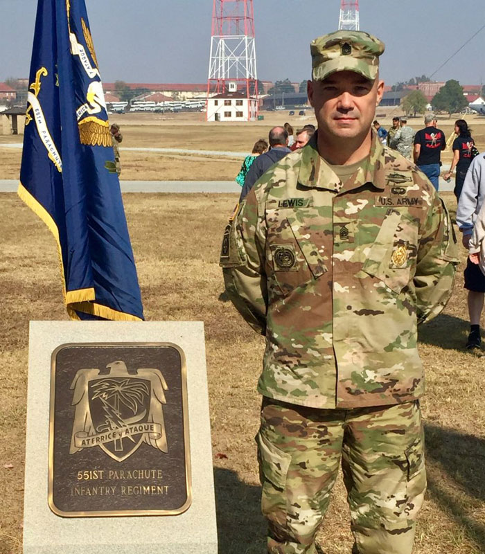 CSM Lewis has completed an Associate’s Degree in General Science from Excelsior College, and is a member of the 551st Parachute Infantry Association, 82d Airborne Division Association, 505th Panther Association, National Infantry Association, Sergeant Audie Murphy Association and Veterans of Foreign Wars.